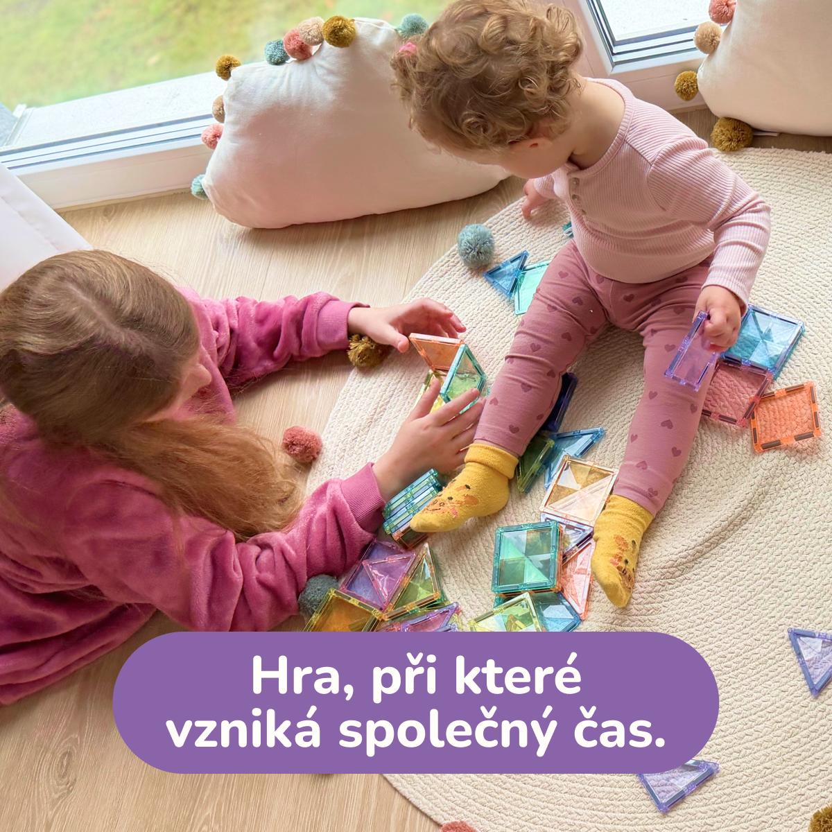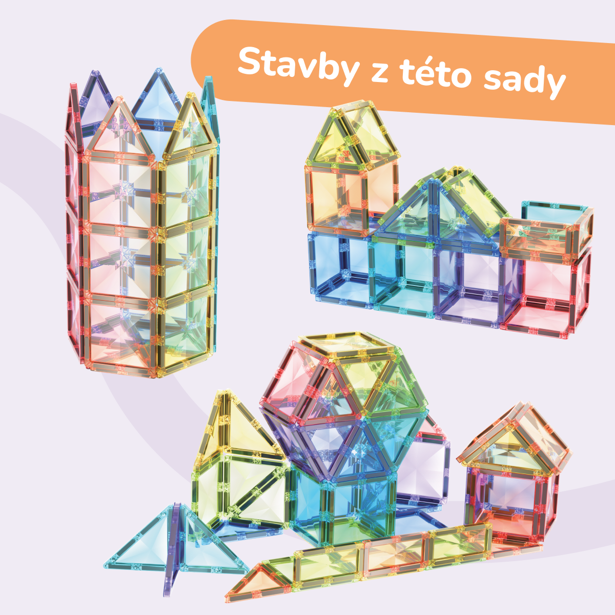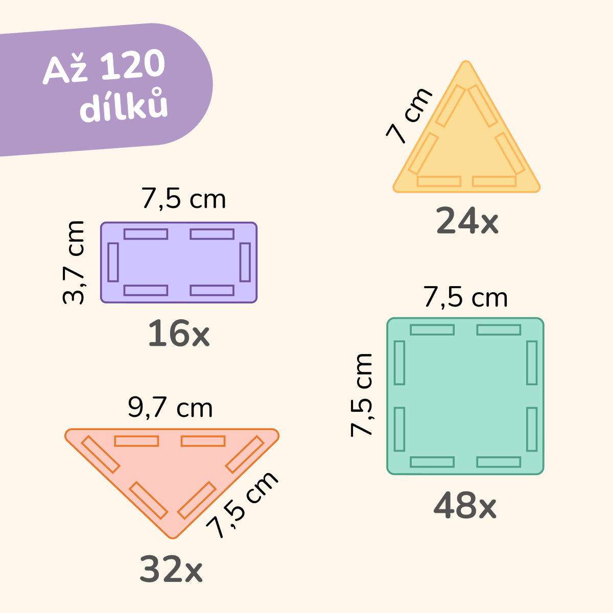 120 magnetických dílků – 2× balení v pastelových barvách. Ideální jako startovací sada pro dítě nebo pro sourozence, aby mohli společně objevovat svět stavění.