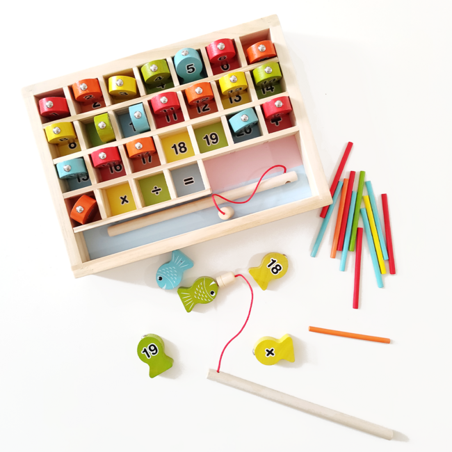 Starší děti mohou soutěžit, kdo vybere nejvyšší hodnotu na rybkách, samozřejmě je potřeba nejen dovednost rukou, ale děti musí zvládnout i matematické úkoly. Počítání pro nejmenší - Vyberte různý počet barevných dřevěných hůlek a požádejte děti, aby ulovily rybky stejné barvy a ve stejném počtu.