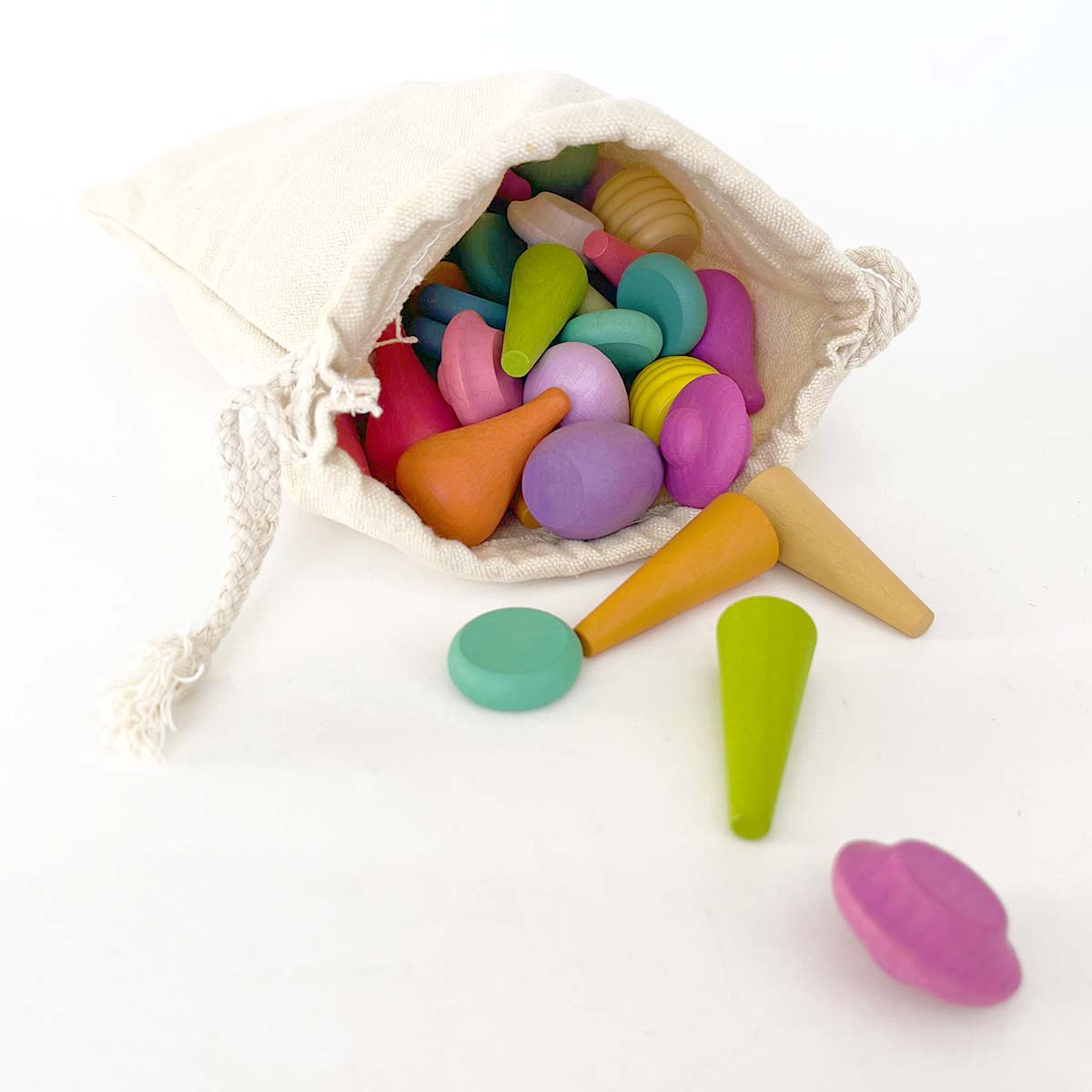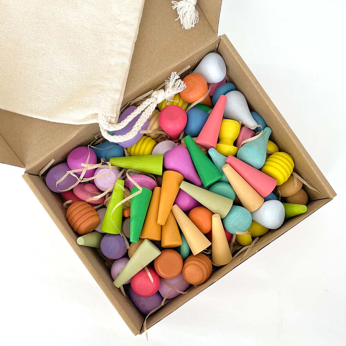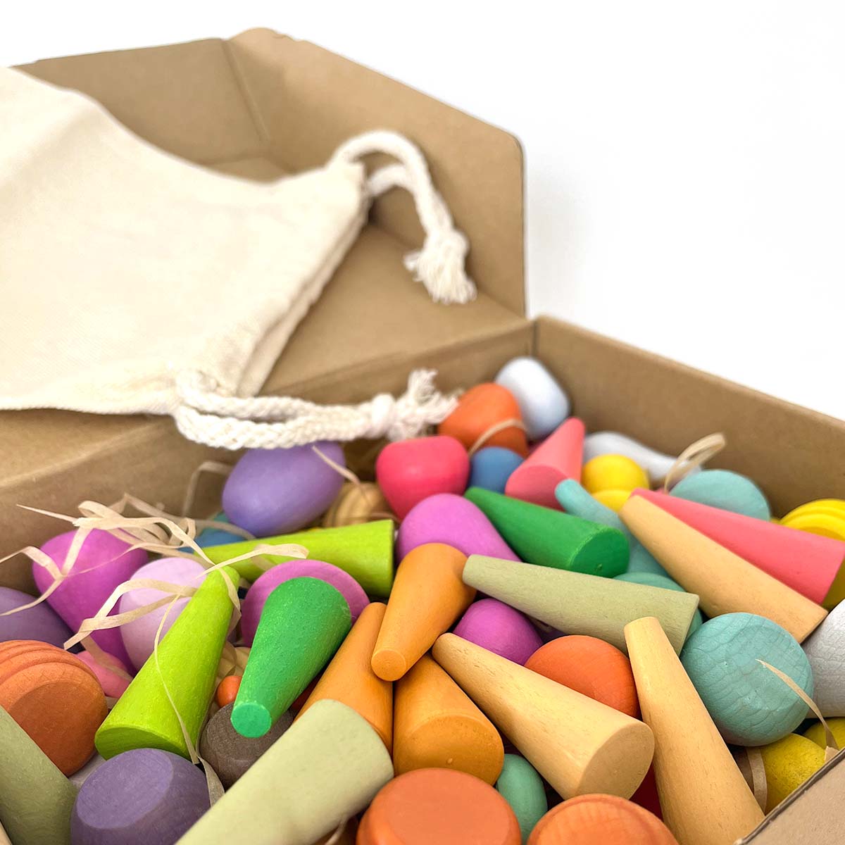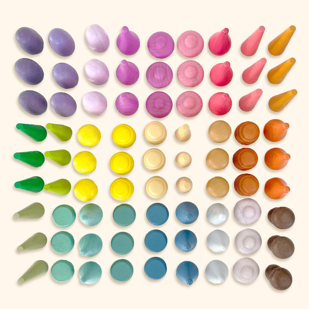81 barevných dřevěných dílků různých tvarů a velikostí (od 2cm do 4,5cm)
