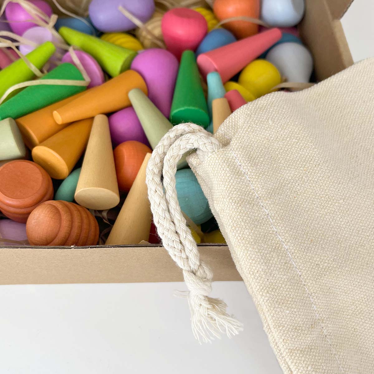 dřevěné dílky jsou v různých barevných provedeních a v různých tvarech, což dětem pomůže blíže rozeznávat a naučit se barvy a tvary,