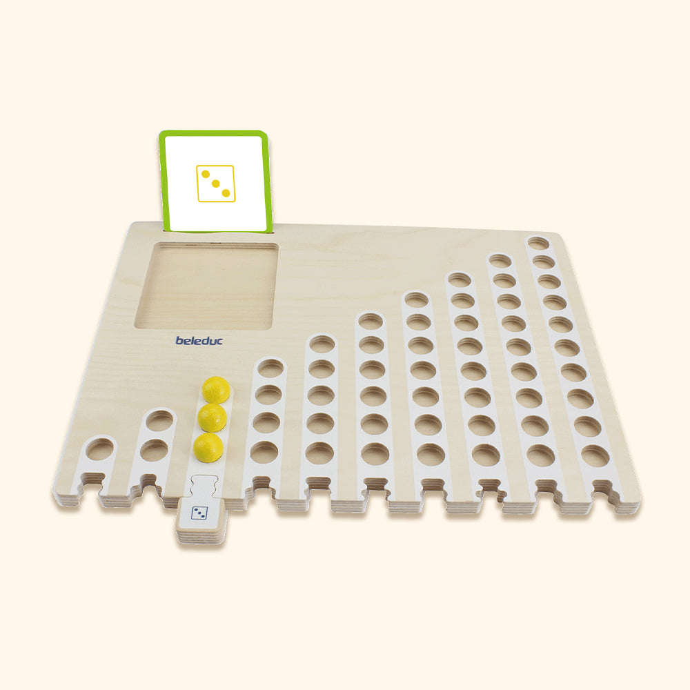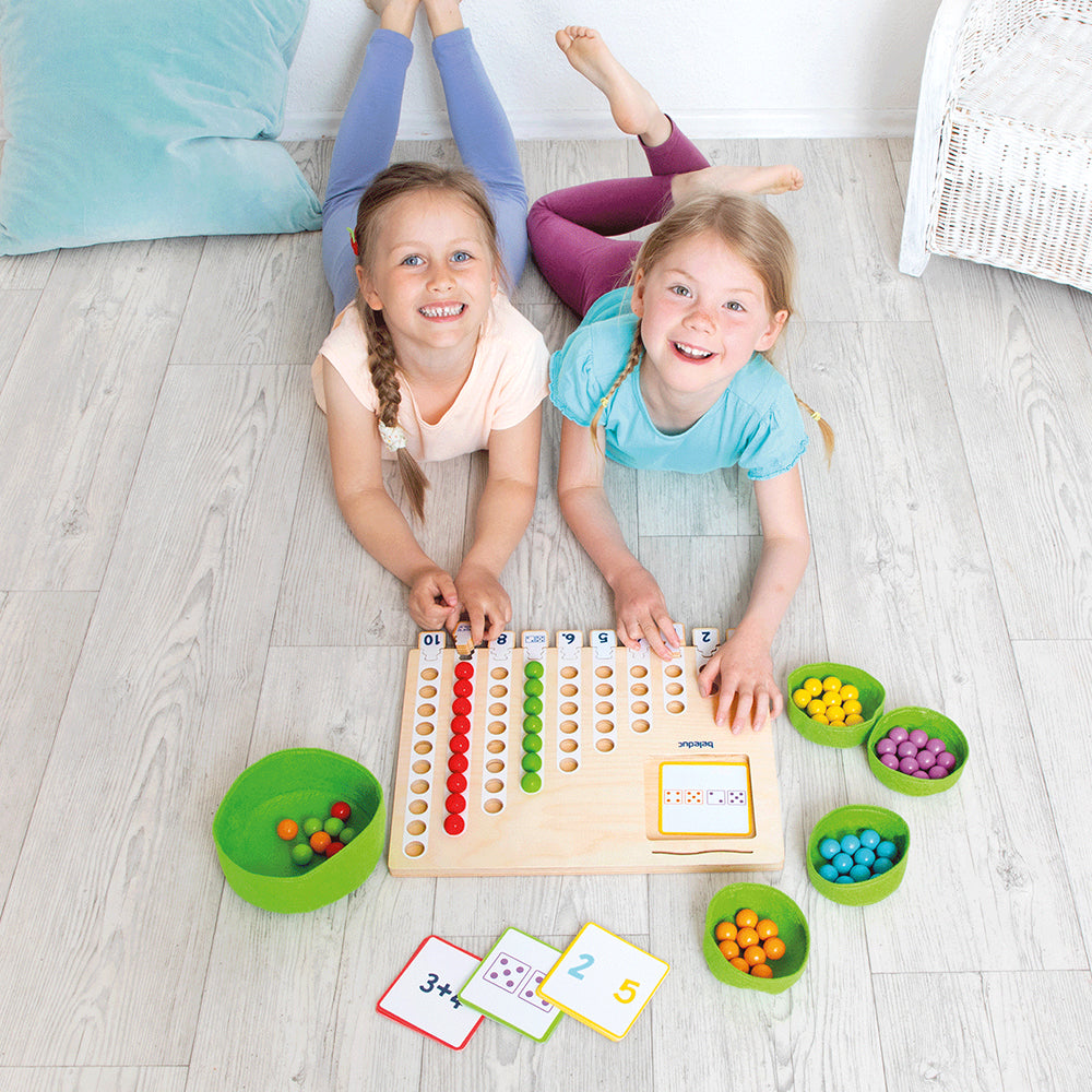 Obzvláště s těmito barevnými dřevěnými kuličkami, které děti umisťují na třídící desku. Kartičky s úkoly jsou k dispozici v různých stupních obtížnosti, čímž lze přizpůsobit úrovni znalostí dětí. Ať už samostatně nebo ve skupině – děti takto objevují číselný rozsah od 1 do 10 hravou formou.