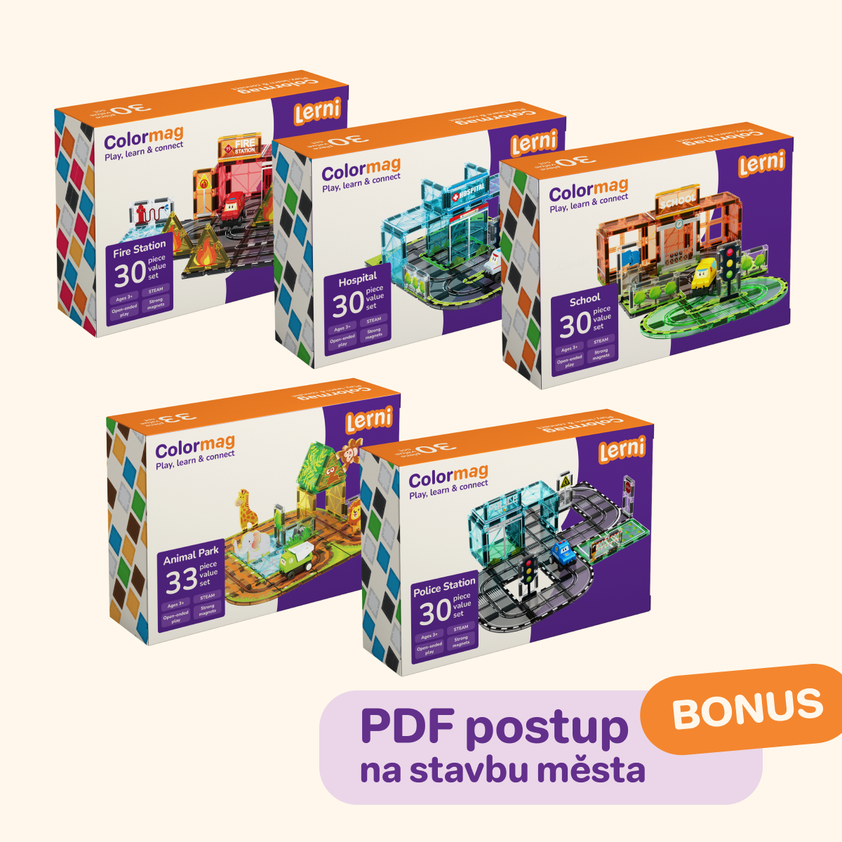 Vytvořte si vlastní velkoměsto plné dobrodružství! Tento exkluzivní balíček obsahuje všechny sety ze série Colormag City – Policie, Hasiči, Nemocnice, Škola a Animal Park. Děti mohou stavět různé budovy, vymýšlet napínavé příběhy a učit se spolupráci, zodpovědnosti a kreativitě.